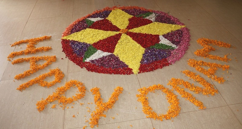 On the day of the celebration, students displayed a beautiful Pokalam (floral carpet) in