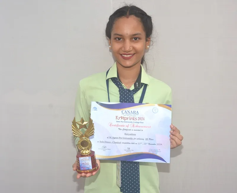 In the State Level Inter Collegiate Fest ‘Footprints 2024’ organized by Canara Pre -University College, Mangaluru on November 22 nd 2024 Ms Kavyashree of I PCME batch has secured 3 rd Place in solo dance competition. Congratulations…