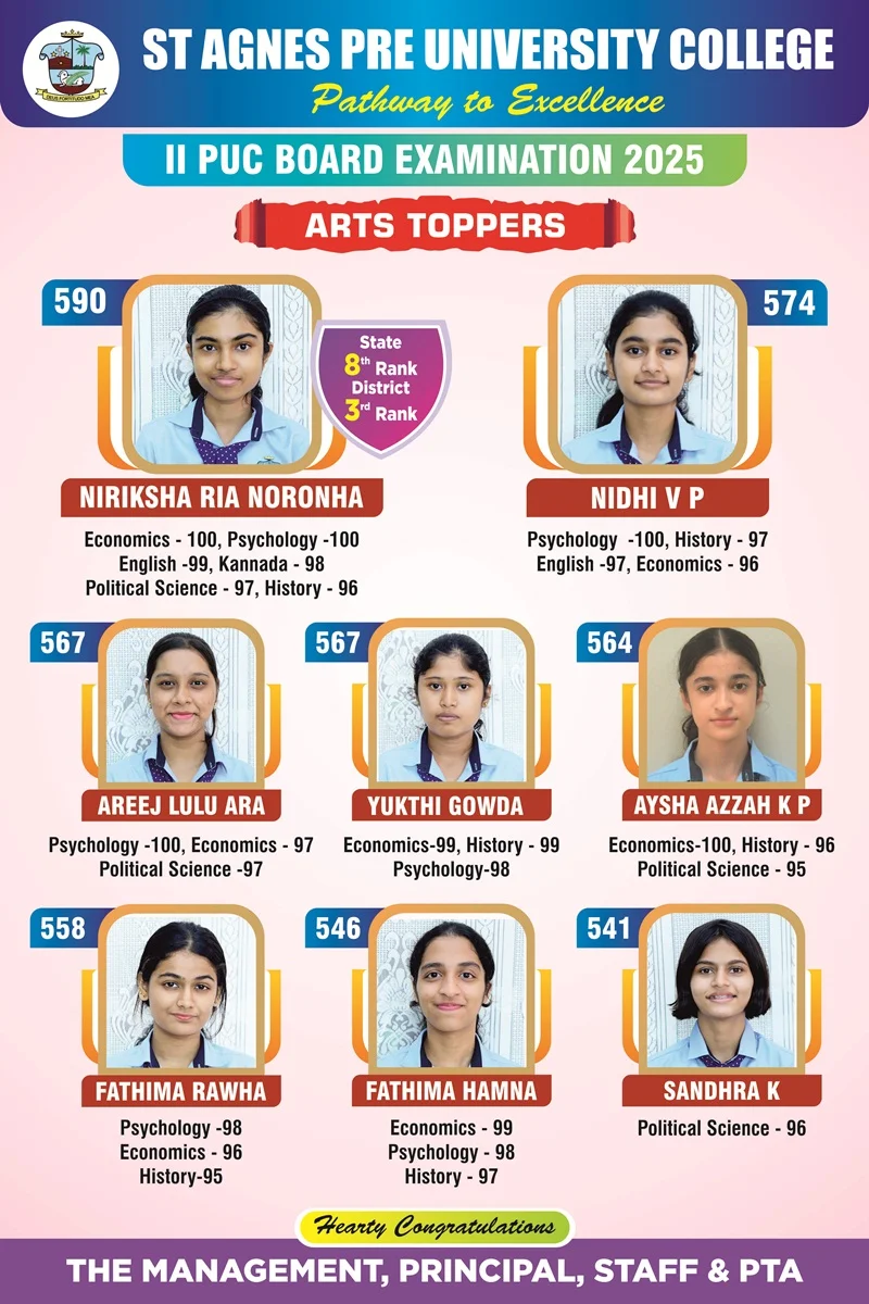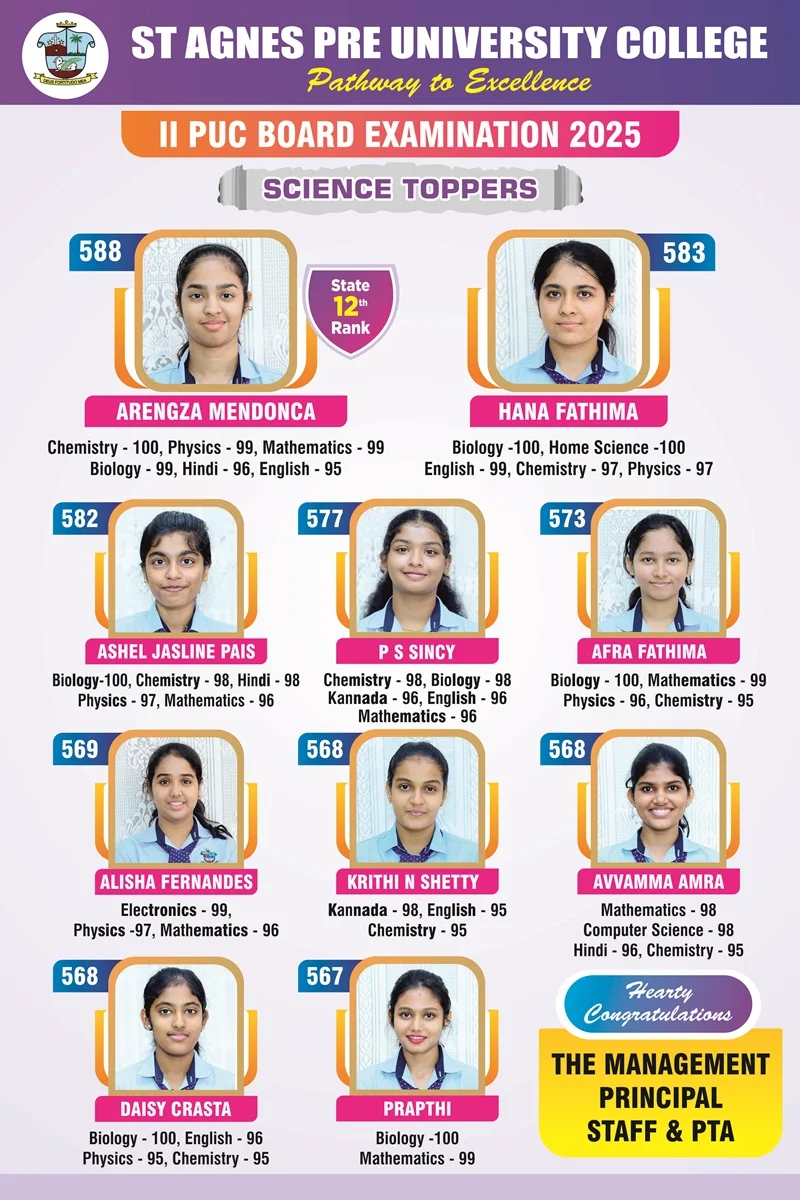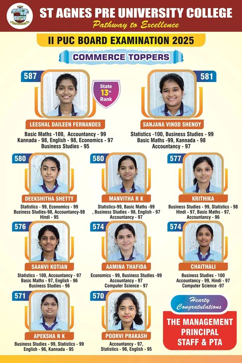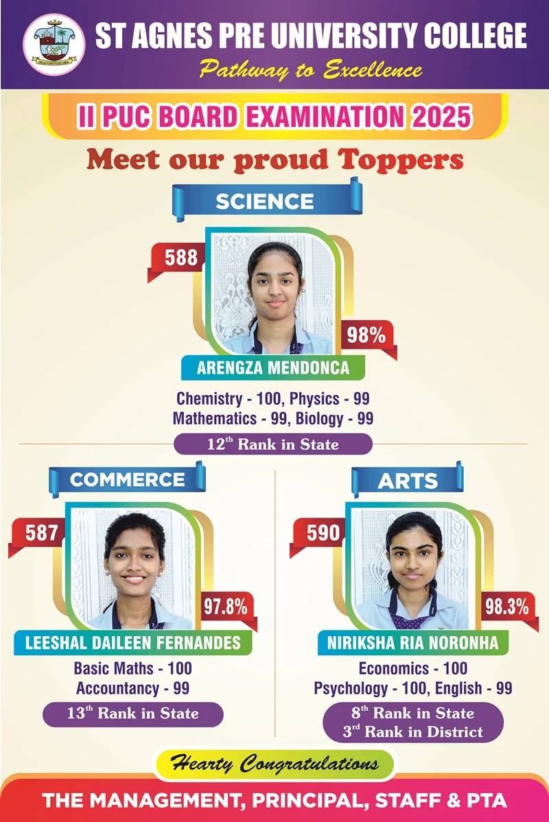 St Agnes PU College is elated with the II PU Board examination results where many students have excelled in their acad emic pursuits.