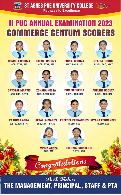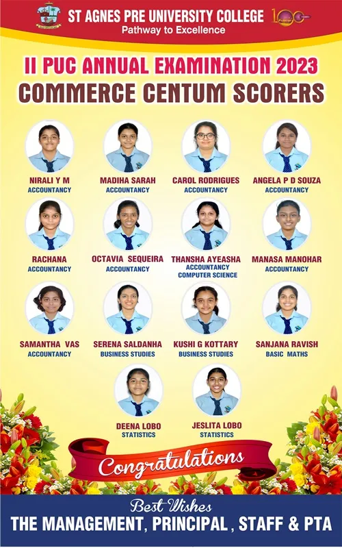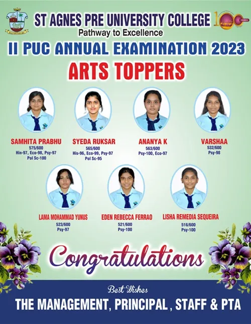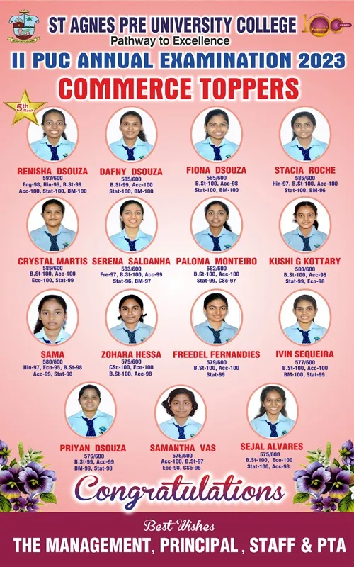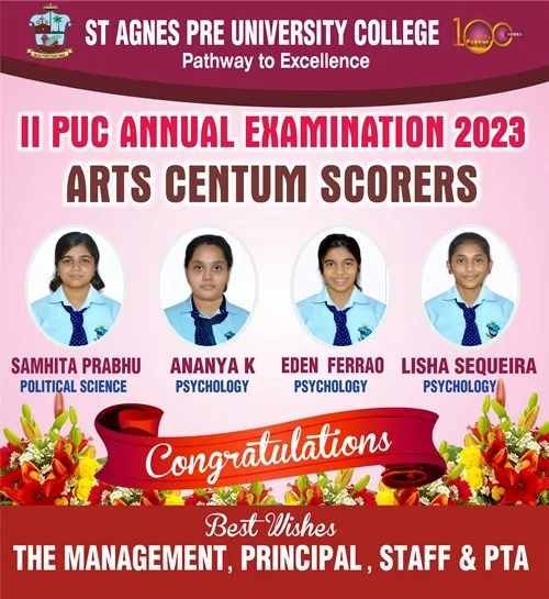 St Agnes PU College feels immensely proud of the heartwarming results garnered by the students in the Karnataka School Examination and Assessment Board 2023. Samruddhi D topped the Science stream with a praiseworthy total of 578 marks. From the Commerce stream Renisha Viola DSouza has secured an impressive 593 marks and a gratifying Centum in Accountancy, Statistics & Basic Maths. She is also the recipient of the 5th Rank at the State Level. The topper from the Arts stream is SamhitaPrabhuwho has got an outstanding total of 575 marks and scored hundred percent in Political Science. The overall pass percentage of 98 is also a remarkable one. We have an outstanding 222 Distinctions, 339 First Classes and 67 students have scored Centum in various subjects.