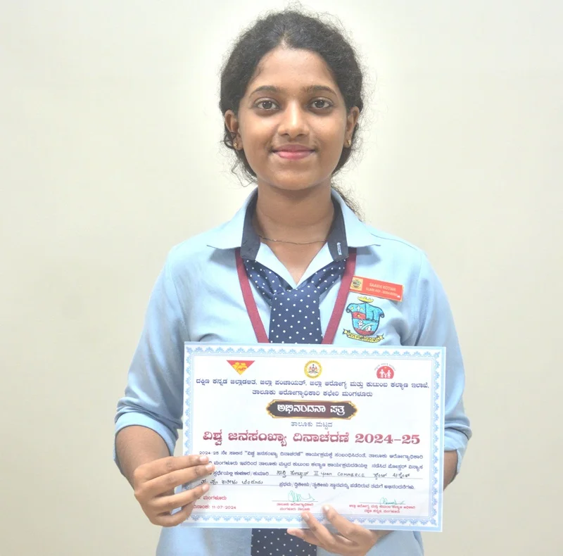 On the occasion of World Population Day, District Health and Family welfare Office, D.K. had organised a poster making competition on the theme “Adverse effects of Population Explosion and Benefits of population control methods” on July 11, 2024. Students of St Agnes PU College enthusiastically participated in this competition. Sanvi Kotian of II PUC BSBA has secured the first place with a cash prize of 5000 rupees. The participants also received words of appreciation from the officials for coming up with creative and beautiful posters.