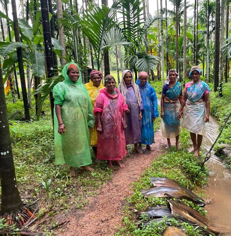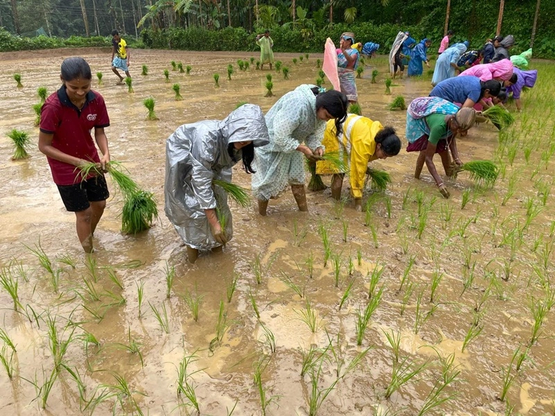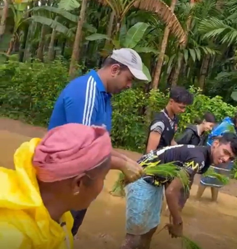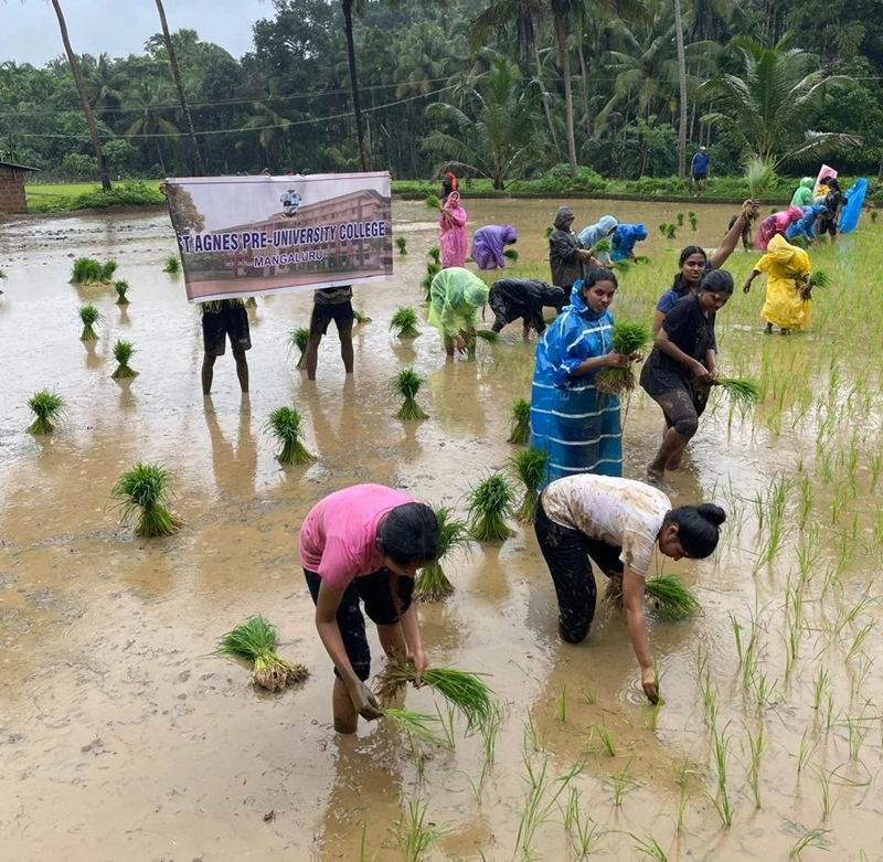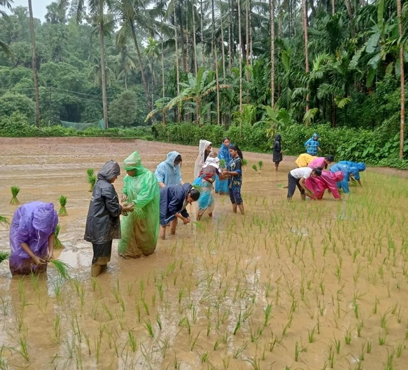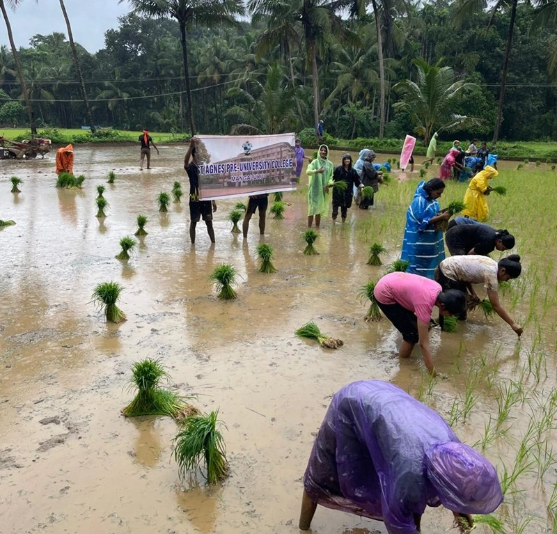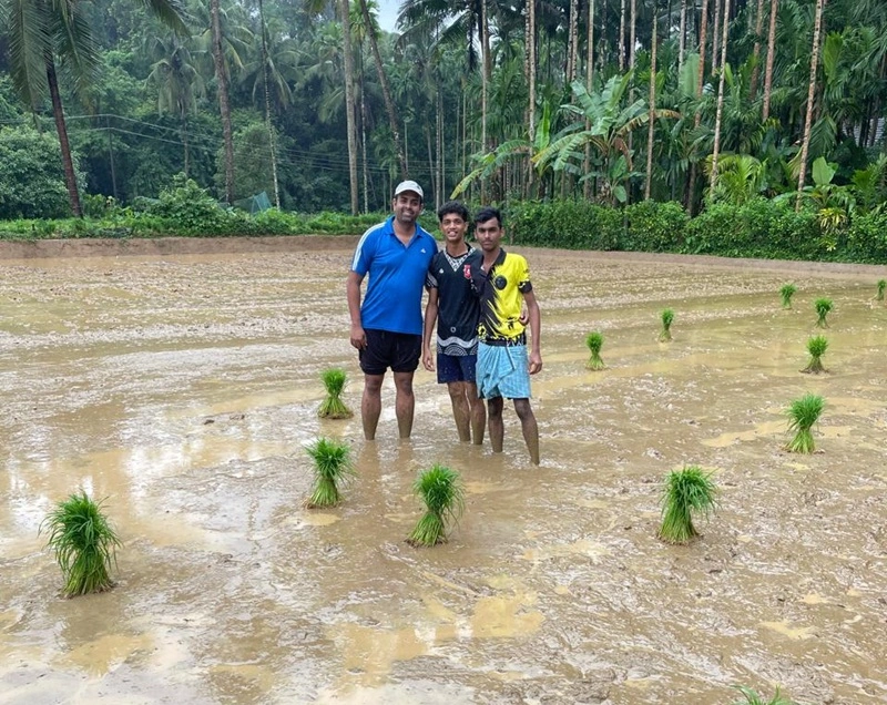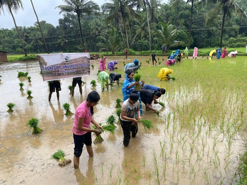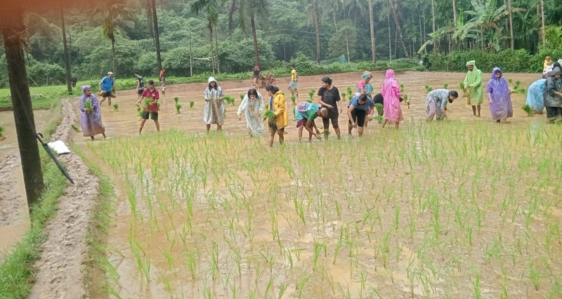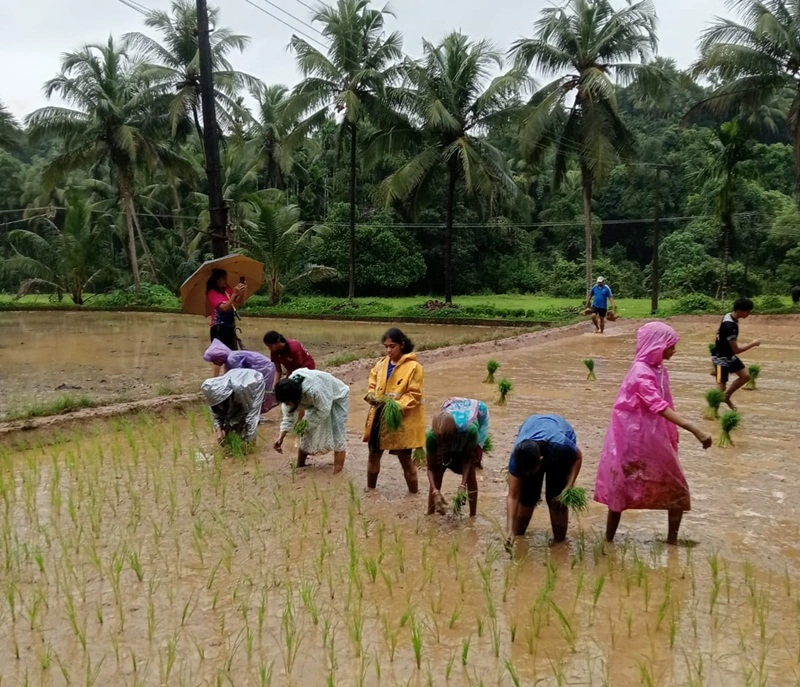 college and the Sequeira family, guiding the students in planting paddy saplings.